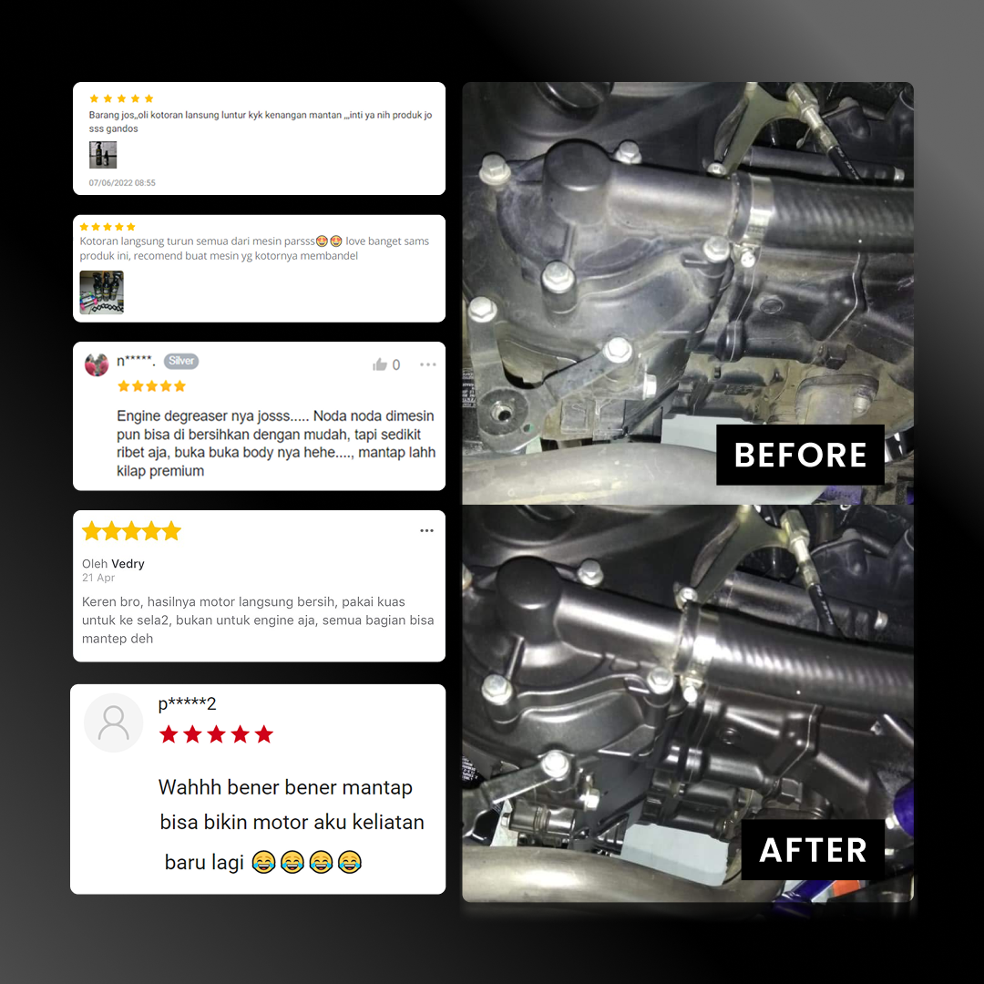 ✅ MENGANGKAT KOTORAN DENGAN MUDAH! - Engine Degreaser mampu mengangkat noda-noda dan kerak pada mesinmu dengan mudah! Tinggal semprot dan usap pake microfiber serta kuas!