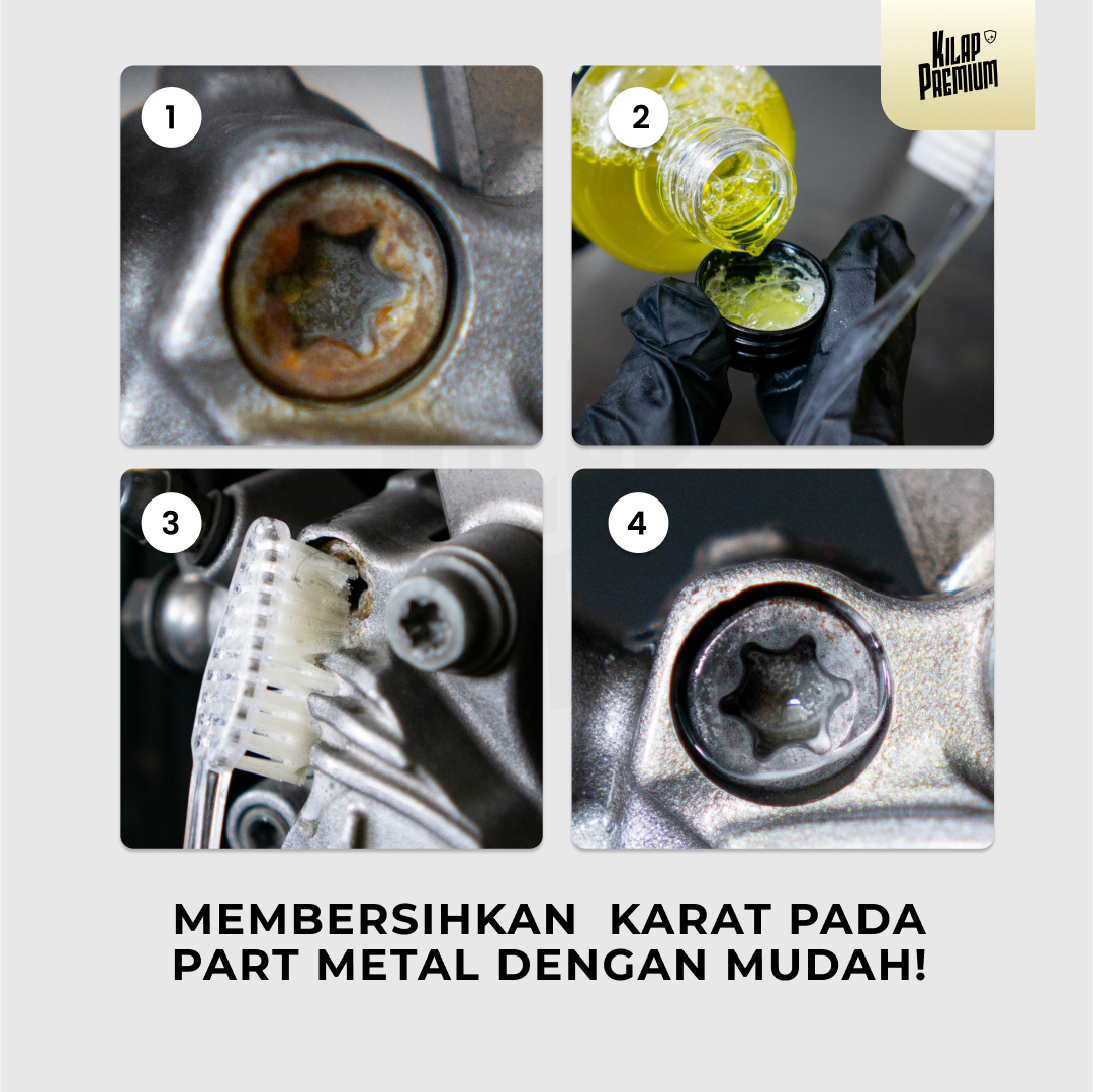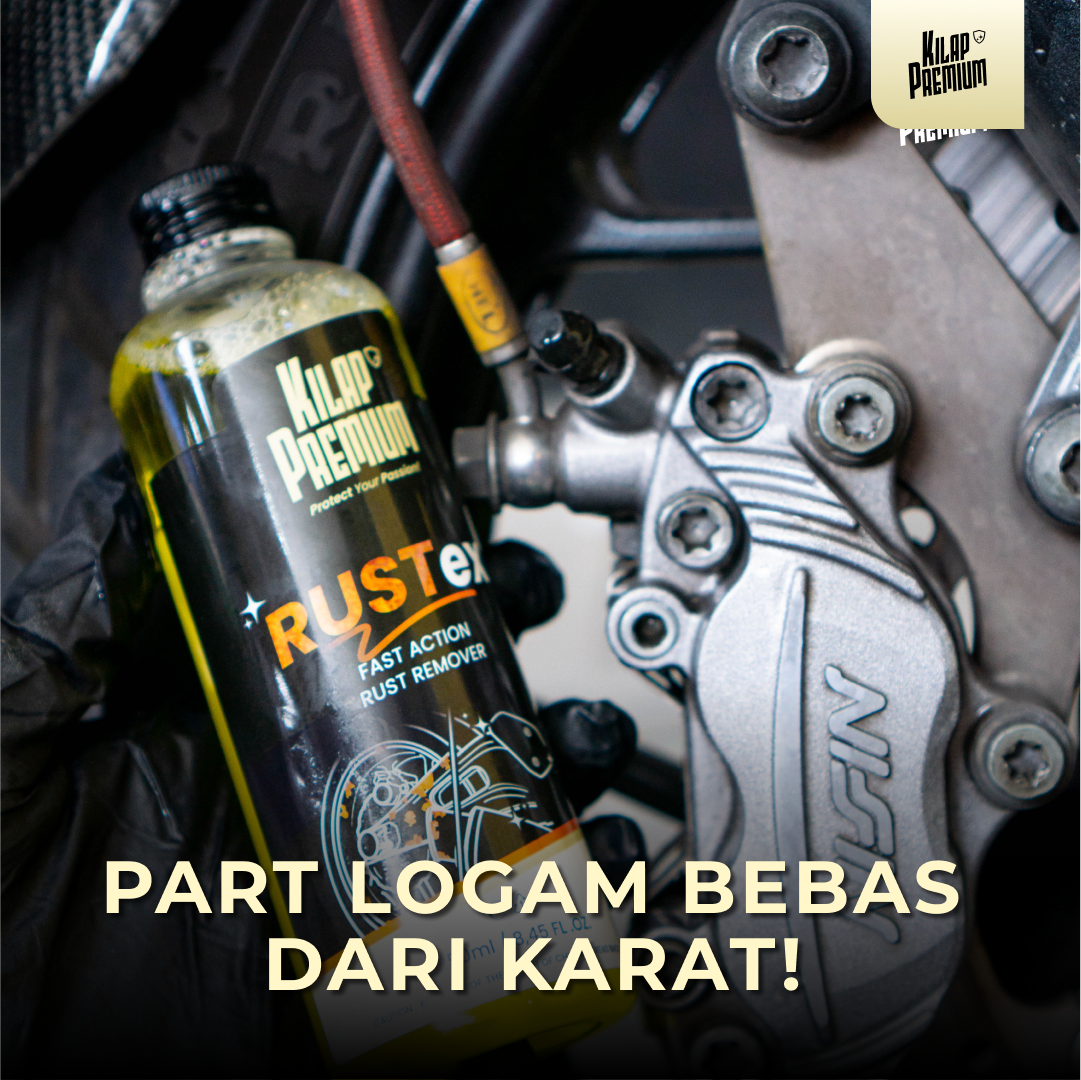 HATI-HATI SAMA KARAT DI PART LOGAM! Karena, karat pada part logam akan memperpendek umur part tersebut, sehingga umurnya tidak bisa lama karena sudah terkikis! Maka dari itu, Rustex by Kilap Premium hadir untuk membersihkan karat dari part logam di motormu! Dengan memakai Rustex, ga hanya membersihkan karat, tapi juga mampu mempertahankan umur part logam di motormu, sehingga motor tetap layak jalan!